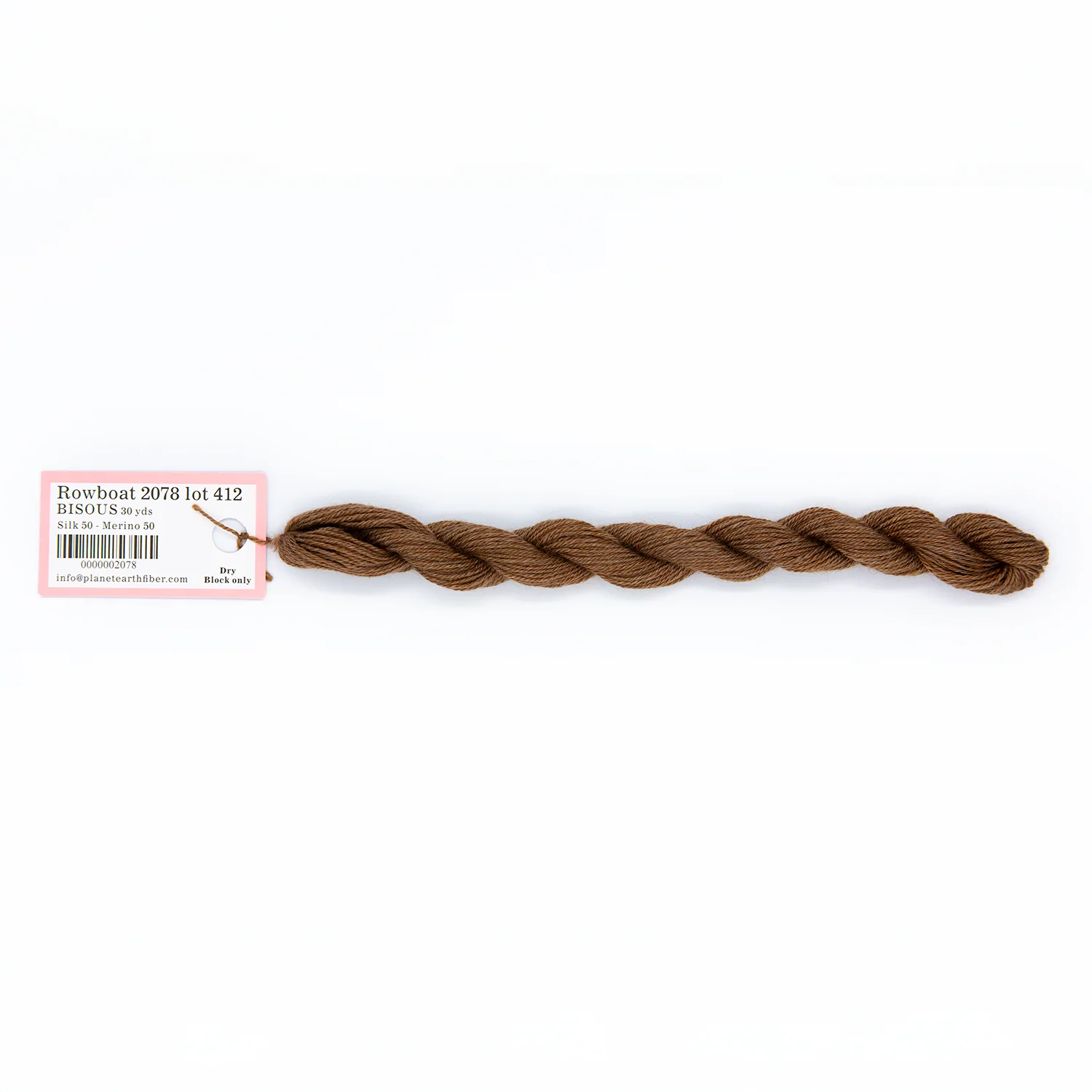 This is Bisous from Planet Earth in color 2078 Rowboat. Bisous is a multipurpose silk-wool blend from Tilli Tomas. Use as-is for very light coverage on 18 mesh or for embroidery. Use additional plies to build up coverage on canvas - for full coverage, we recommend 2 plies on 18 mesh and 3 plies on 13 mesh.
