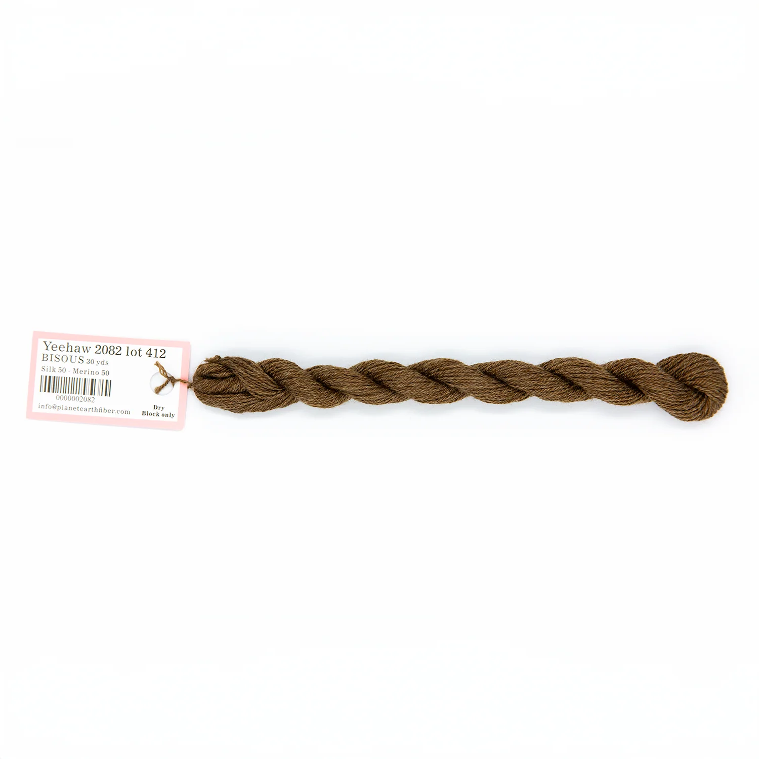This is Bisous from Planet Earth in color 2082 Yeehaw. Bisous is a multipurpose silk-wool blend from Tilli Tomas. Use as-is for very light coverage on 18 mesh or for embroidery. Use additional plies to build up coverage on canvas - for full coverage, we recommend 2 plies on 18 mesh and 3 plies on 13 mesh.