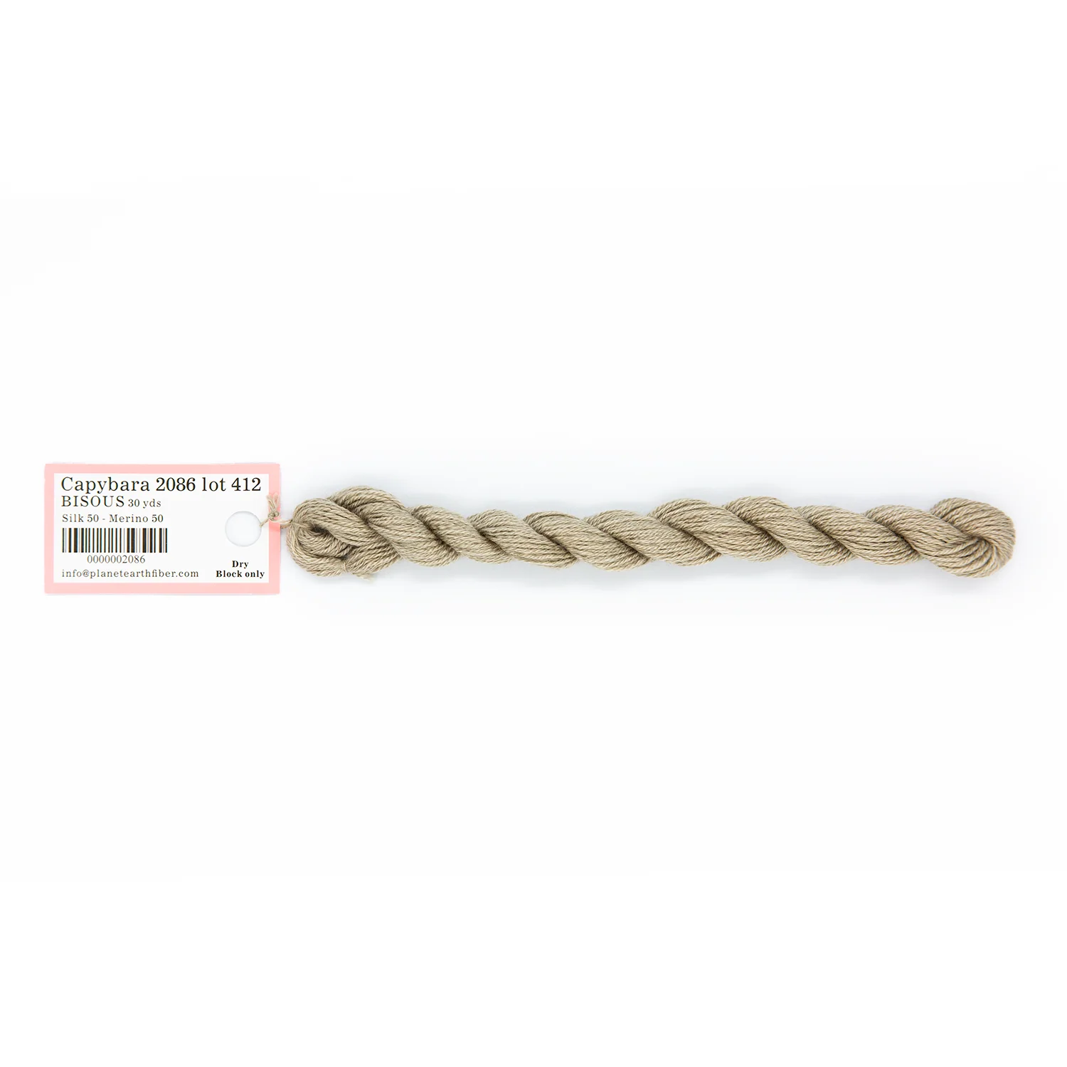 This is Bisous from Planet Earth in color 2086 Capybara. Bisous is a multipurpose silk-wool blend from Tilli Tomas. Use as-is for very light coverage on 18 mesh or for embroidery. Use additional plies to build up coverage on canvas - for full coverage, we recommend 2 plies on 18 mesh and 3 plies on 13 mesh.