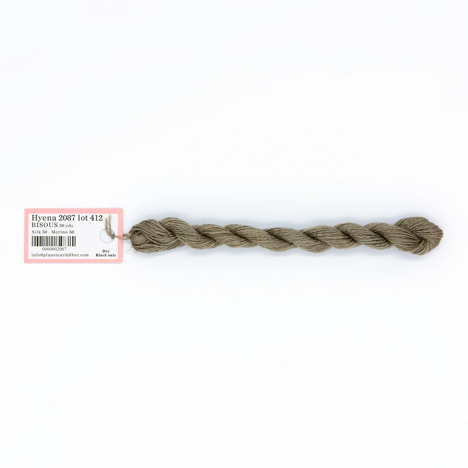 This is Bisous from Planet Earth in color 2087 Hyena. Bisous is a multipurpose silk-wool blend from Tilli Tomas. Use as-is for very light coverage on 18 mesh or for embroidery. Use additional plies to build up coverage on canvas - for full coverage, we recommend 2 plies on 18 mesh and 3 plies on 13 mesh.