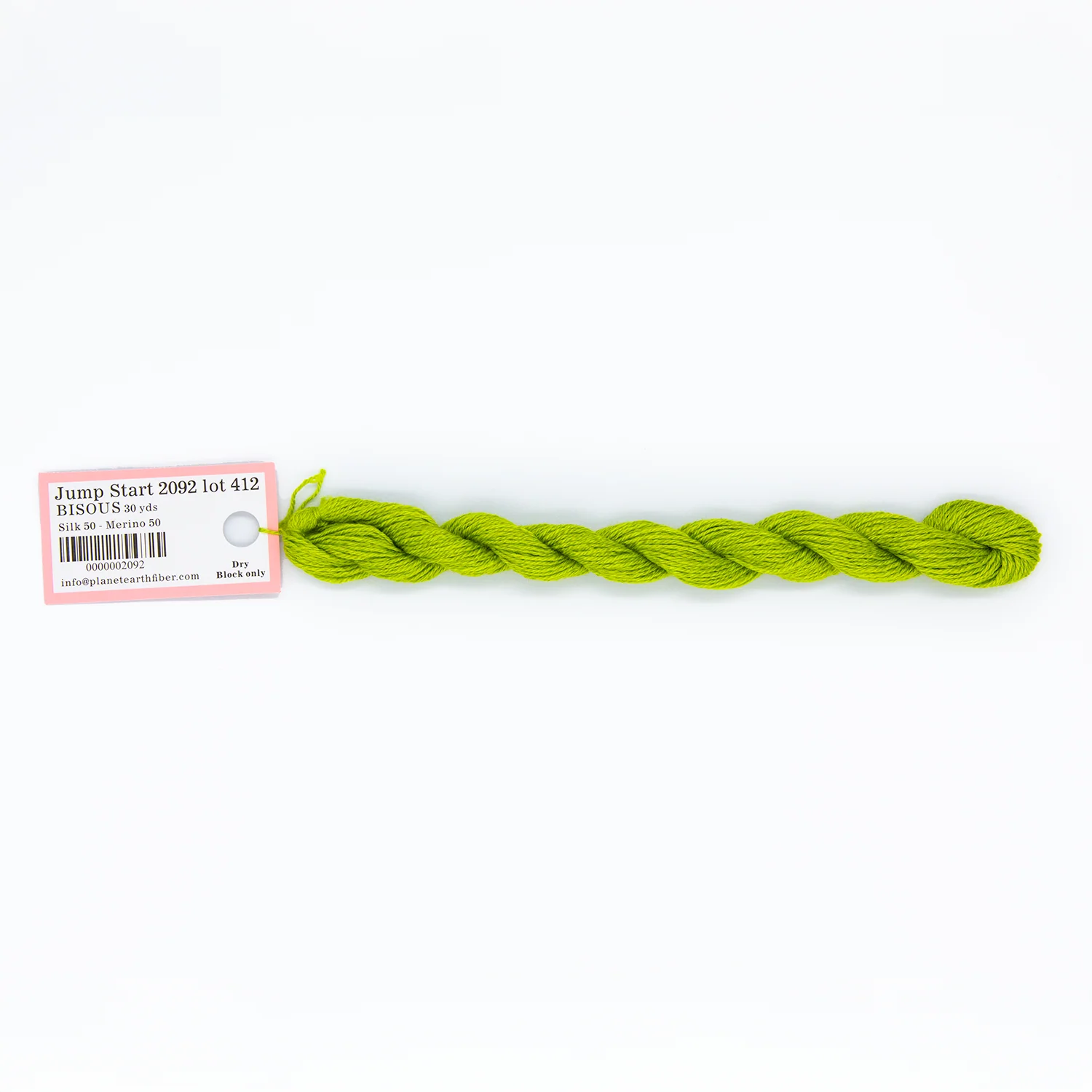 This is Bisous from Planet Earth in color 2092 Jump Start. Bisous is a multipurpose silk-wool blend from Tilli Tomas. Use as-is for very light coverage on 18 mesh or for embroidery. Use additional plies to build up coverage on canvas - for full coverage, we recommend 2 plies on 18 mesh and 3 plies on 13 mesh.