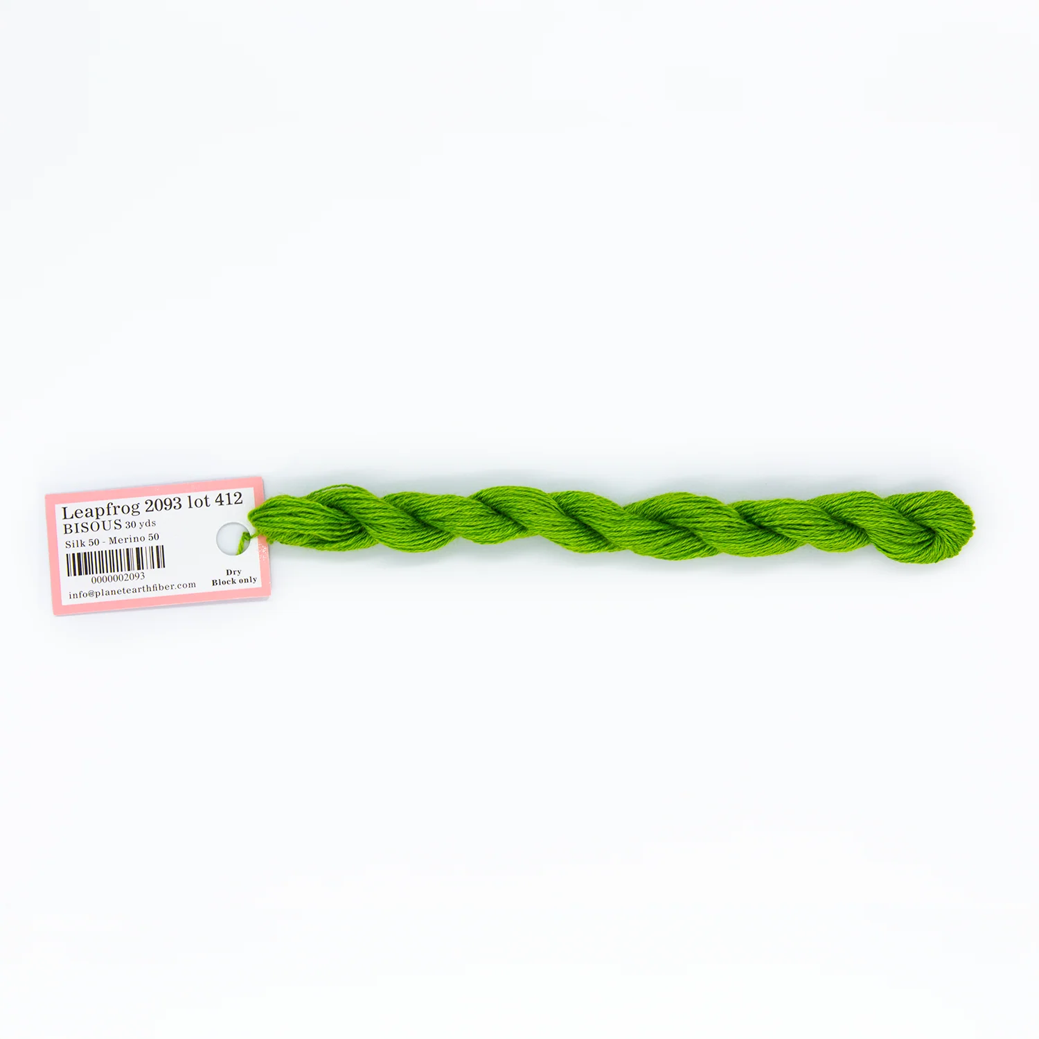 This is Bisous from Planet Earth in color 2093 Leapfrog. Bisous is a multipurpose silk-wool blend from Tilli Tomas. Use as-is for very light coverage on 18 mesh or for embroidery. Use additional plies to build up coverage on canvas - for full coverage, we recommend 2 plies on 18 mesh and 3 plies on 13 mesh.