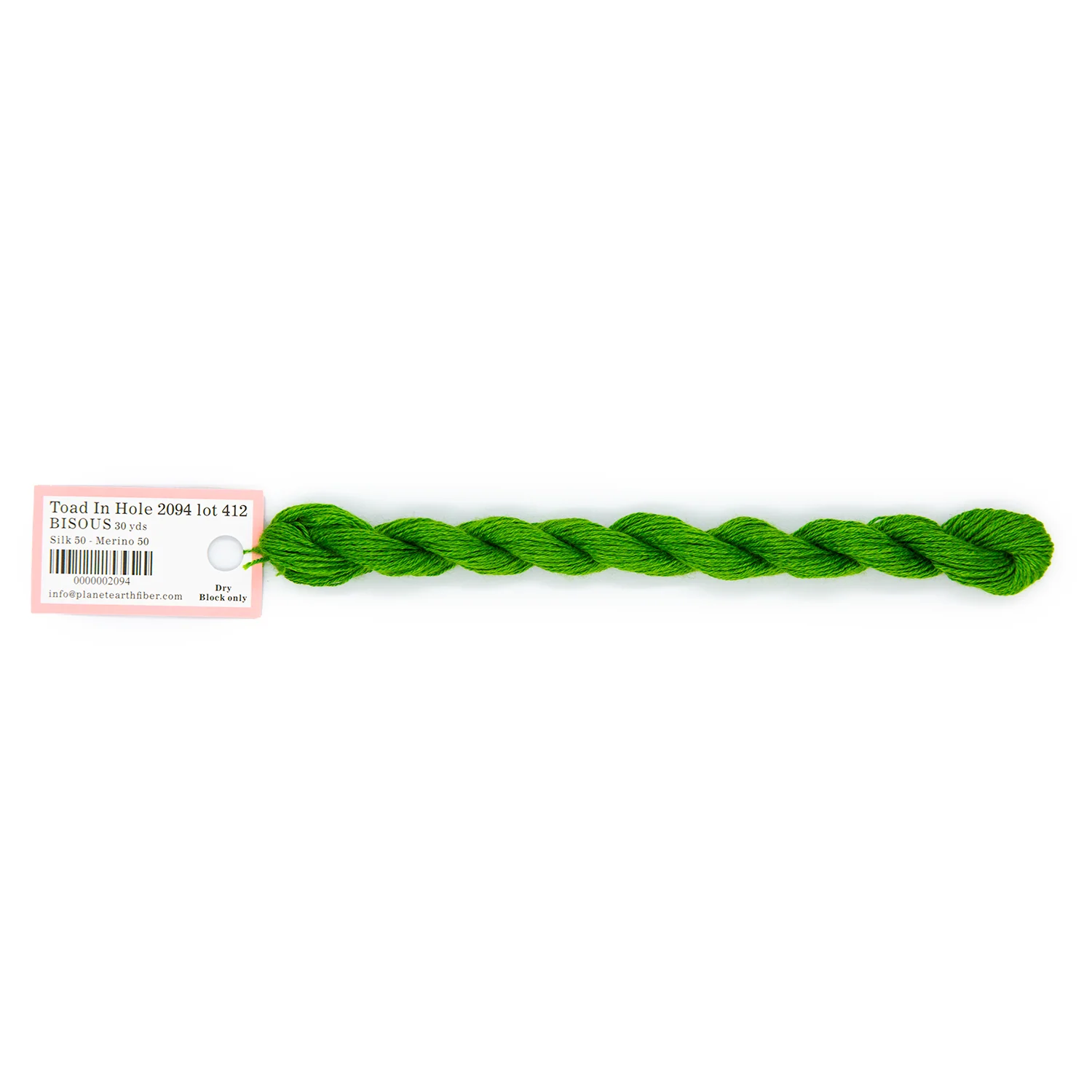 This is Bisous from Planet Earth in color 2094 Toad in Hole. Bisous is a multipurpose silk-wool blend from Tilli Tomas. Use as-is for very light coverage on 18 mesh or for embroidery. Use additional plies to build up coverage on canvas - for full coverage, we recommend 2 plies on 18 mesh and 3 plies on 13 mesh.