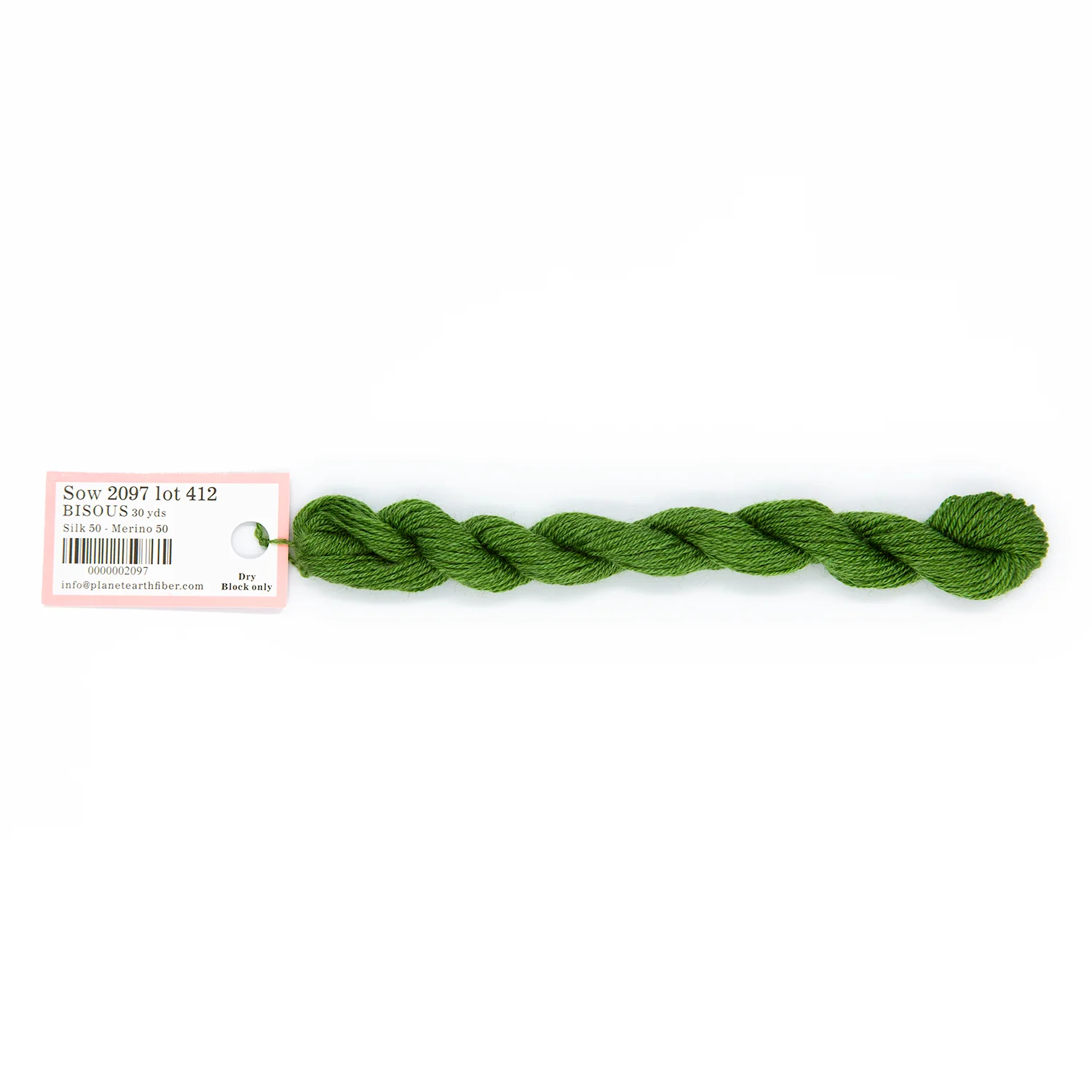 This is Bisous from Planet Earth in color 2097 Sow. Bisous is a multipurpose silk-wool blend from Tilli Tomas. Use as-is for very light coverage on 18 mesh or for embroidery. Use additional plies to build up coverage on canvas - for full coverage, we recommend 2 plies on 18 mesh and 3 plies on 13 mesh.