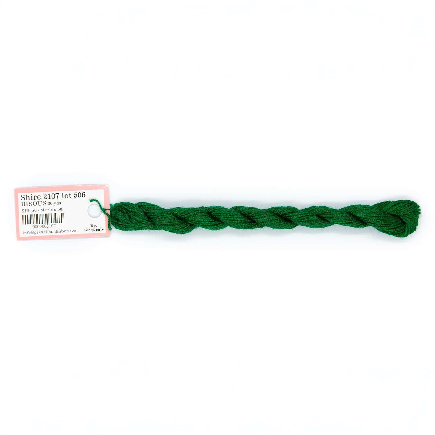 This is Bisous from Planet Earth in color 2107 Shire. Bisous is a multipurpose silk-wool blend from Tilli Tomas. Use as-is for very light coverage on 18 mesh or for embroidery. Use additional plies to build up coverage on canvas - for full coverage, we recommend 2 plies on 18 mesh and 3 plies on 13 mesh.