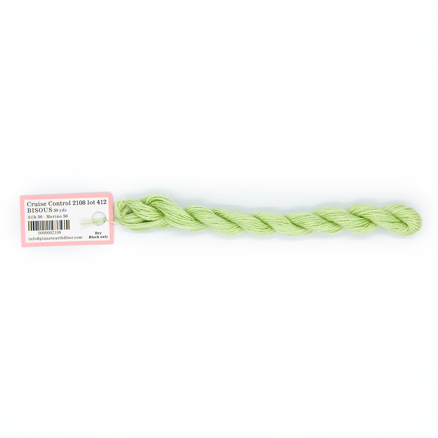 This is Bisous from Planet Earth in color 2108 Cruise Control. Bisous is a multipurpose silk-wool blend from Tilli Tomas. Use as-is for very light coverage on 18 mesh or for embroidery. Use additional plies to build up coverage on canvas - for full coverage, we recommend 2 plies on 18 mesh and 3 plies on 13 mesh.