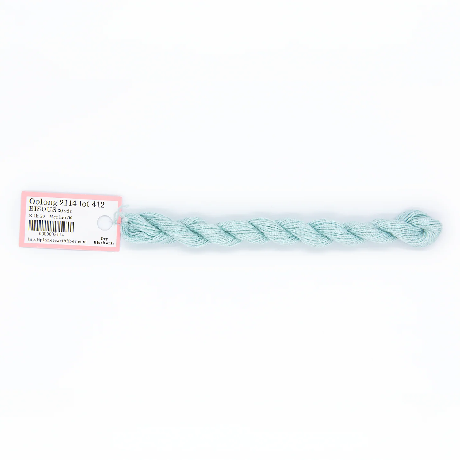 This is Bisous from Planet Earth in color 2114 Oolong. Bisous is a multipurpose silk-wool blend from Tilli Tomas. Use as-is for very light coverage on 18 mesh or for embroidery. Use additional plies to build up coverage on canvas - for full coverage, we recommend 2 plies on 18 mesh and 3 plies on 13 mesh.