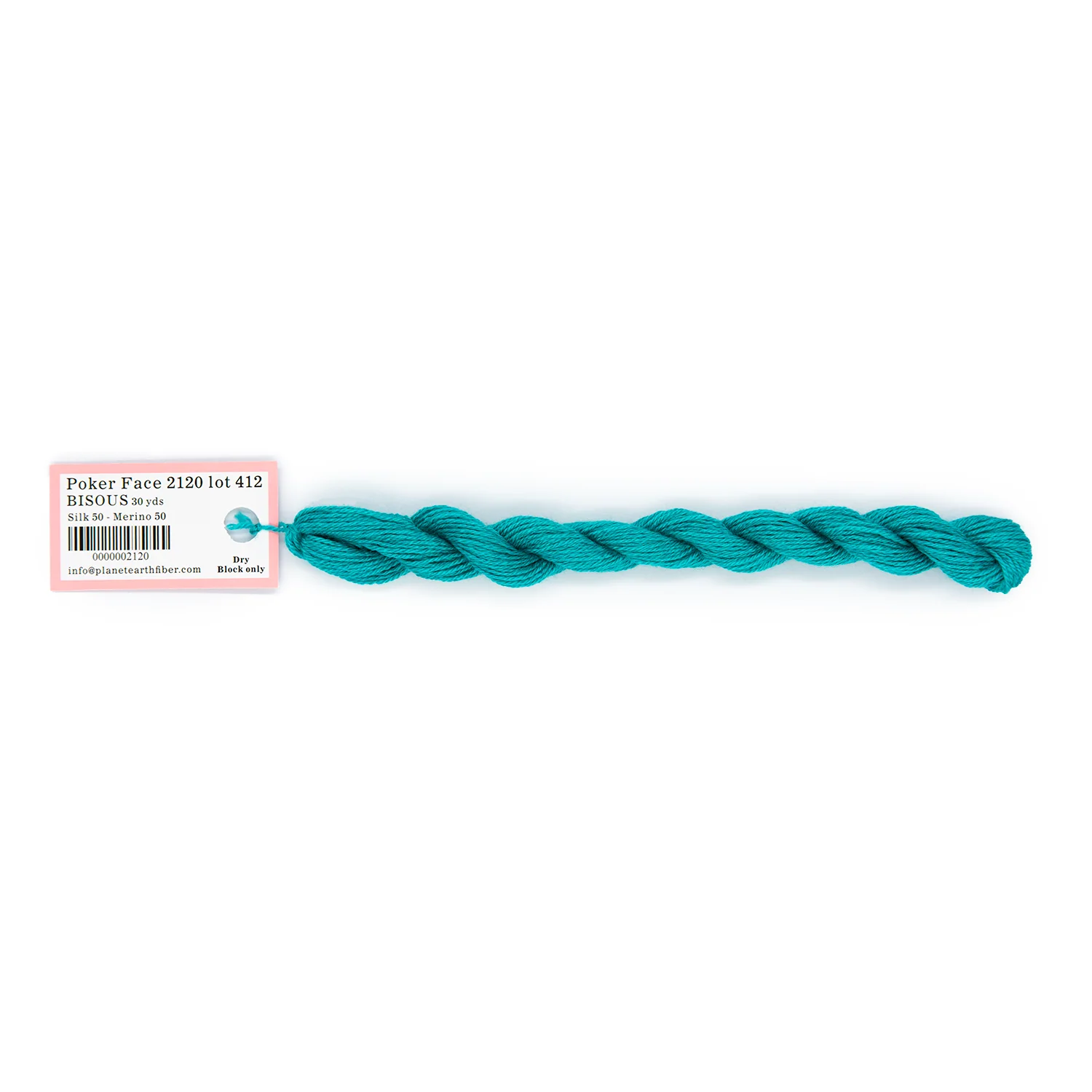 This is Bisous from Planet Earth in color 2120 Poker Face. Bisous is a multipurpose silk-wool blend from Tilli Tomas. Use as-is for very light coverage on 18 mesh or for embroidery. Use additional plies to build up coverage on canvas - for full coverage, we recommend 2 plies on 18 mesh and 3 plies on 13 mesh.