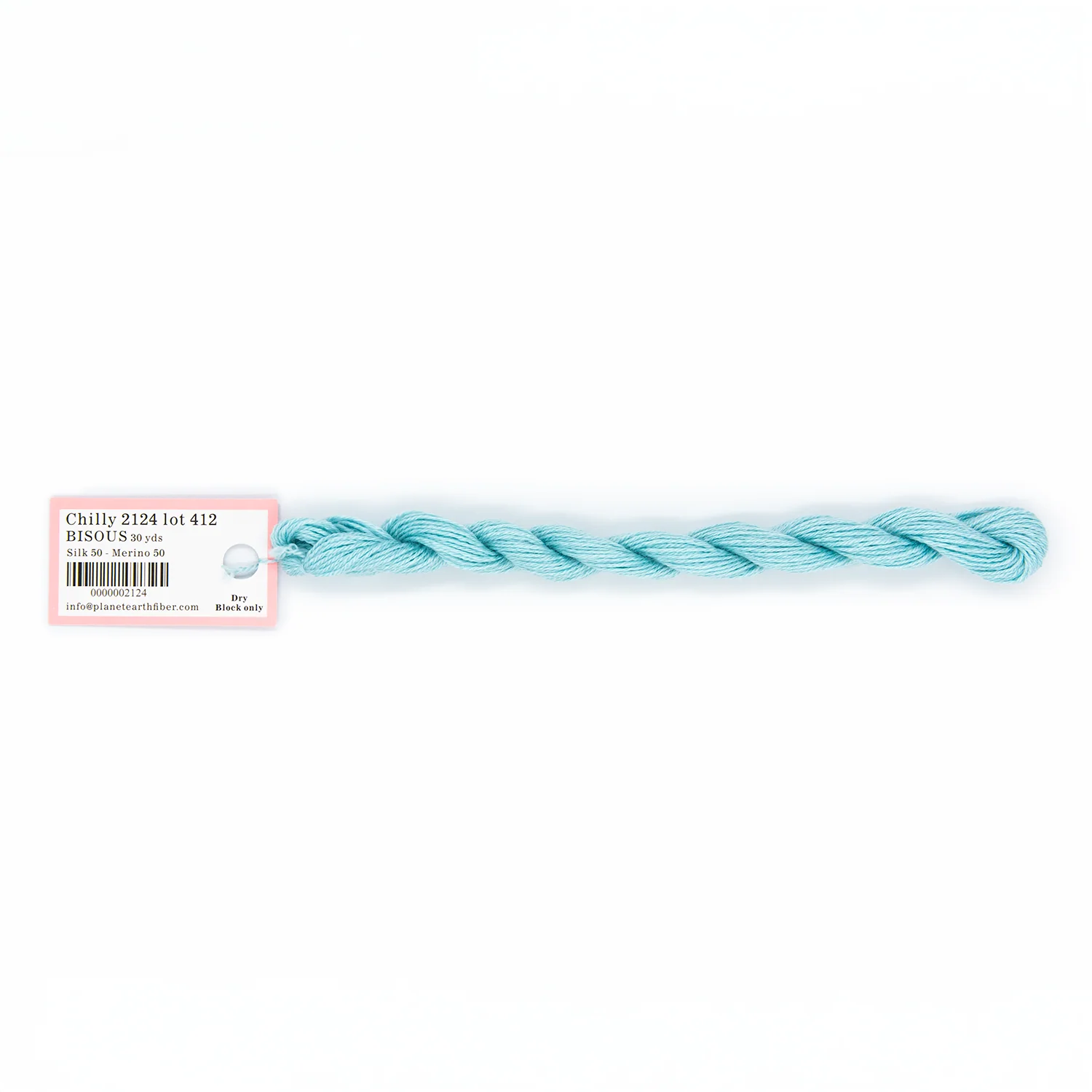 This is Bisous from Planet Earth in color 2124 Chilly. Bisous is a multipurpose silk-wool blend from Tilli Tomas. Use as-is for very light coverage on 18 mesh or for embroidery. Use additional plies to build up coverage on canvas - for full coverage, we recommend 2 plies on 18 mesh and 3 plies on 13 mesh.