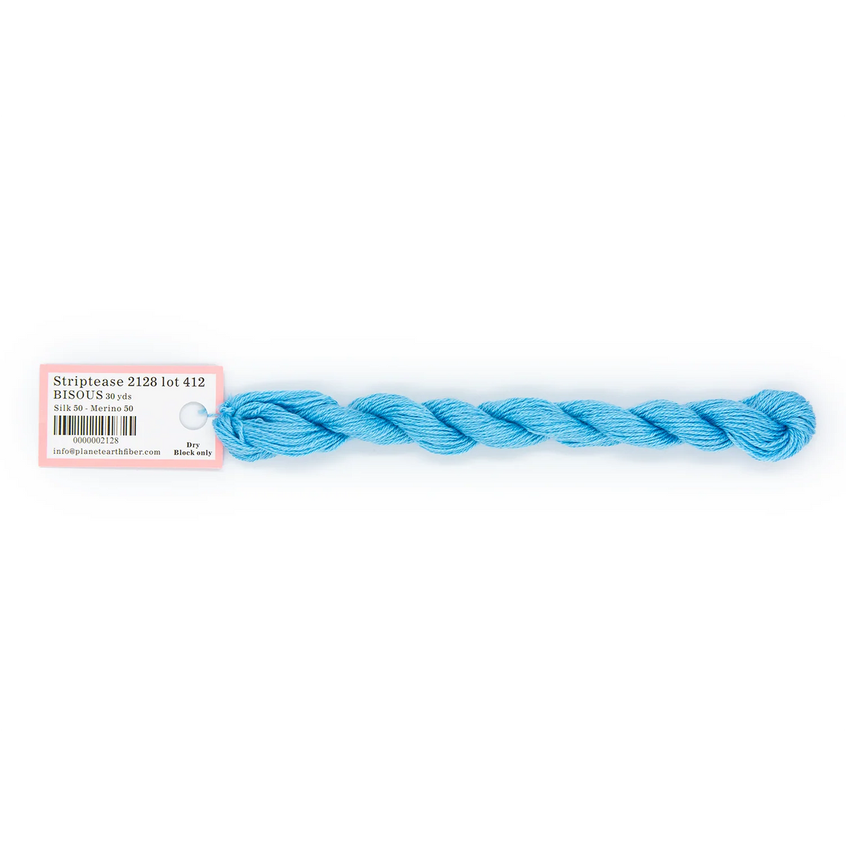 This is Bisous from Planet Earth in color 2128 Striptease. Bisous is a multipurpose silk-wool blend from Tilli Tomas. Use as-is for very light coverage on 18 mesh or for embroidery. Use additional plies to build up coverage on canvas - for full coverage, we recommend 2 plies on 18 mesh and 3 plies on 13 mesh.