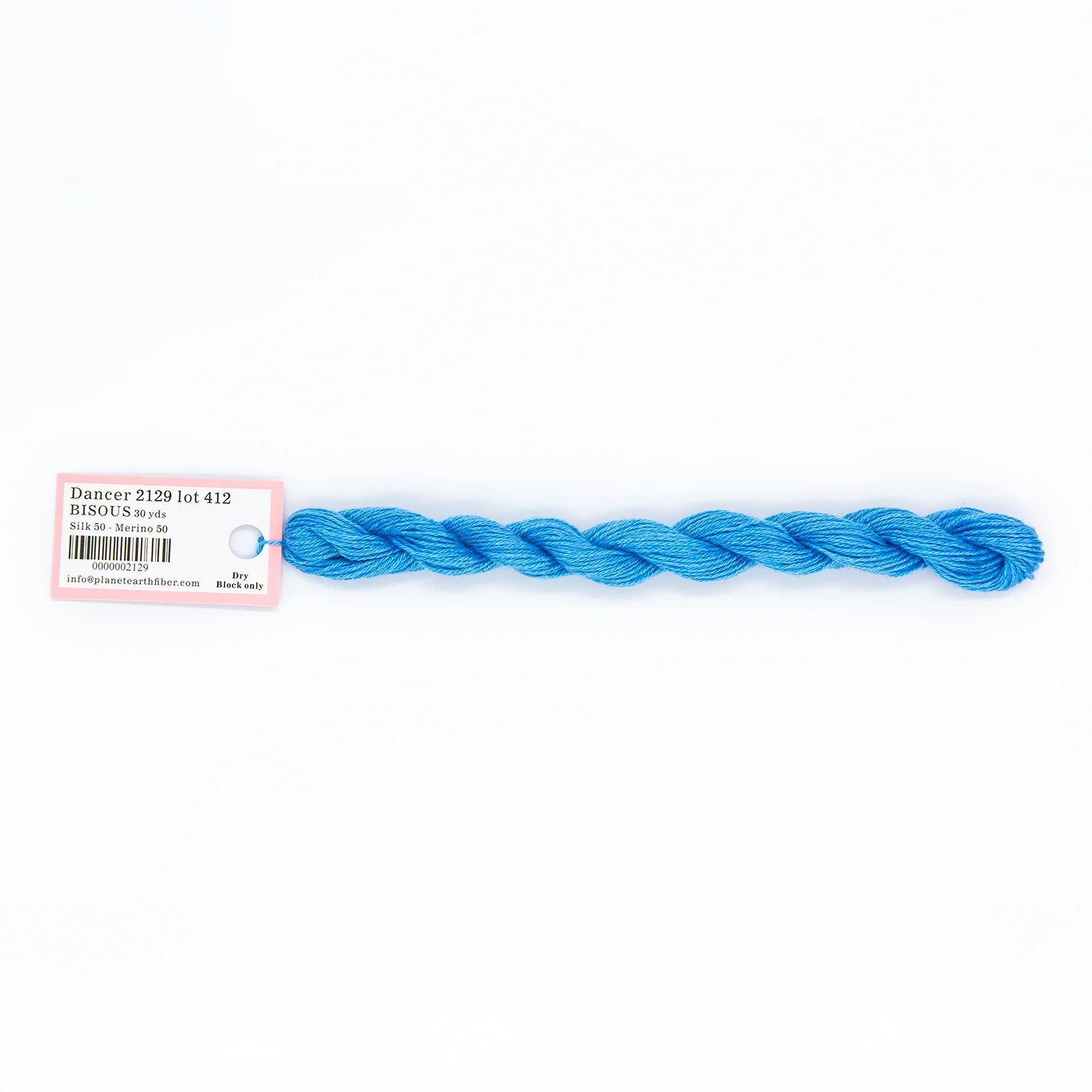 This is Bisous from Planet Earth in color 2129 Dancer. Bisous is a multipurpose silk-wool blend from Tilli Tomas. Use as-is for very light coverage on 18 mesh or for embroidery. Use additional plies to build up coverage on canvas - for full coverage, we recommend 2 plies on 18 mesh and 3 plies on 13 mesh.