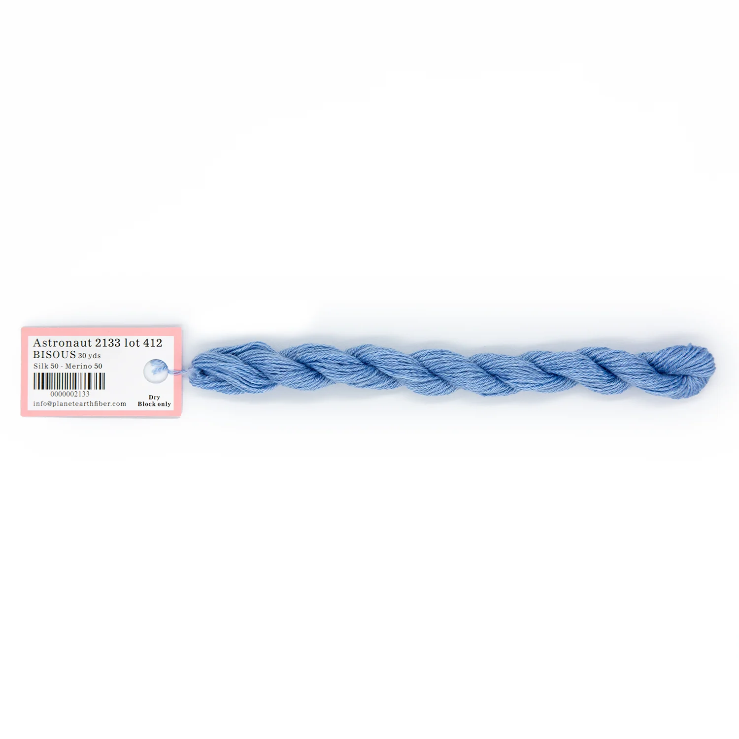 This is Bisous from Planet Earth in color 2133 Astronaut. Bisous is a multipurpose silk-wool blend from Tilli Tomas. Use as-is for very light coverage on 18 mesh or for embroidery. Use additional plies to build up coverage on canvas - for full coverage, we recommend 2 plies on 18 mesh and 3 plies on 13 mesh.