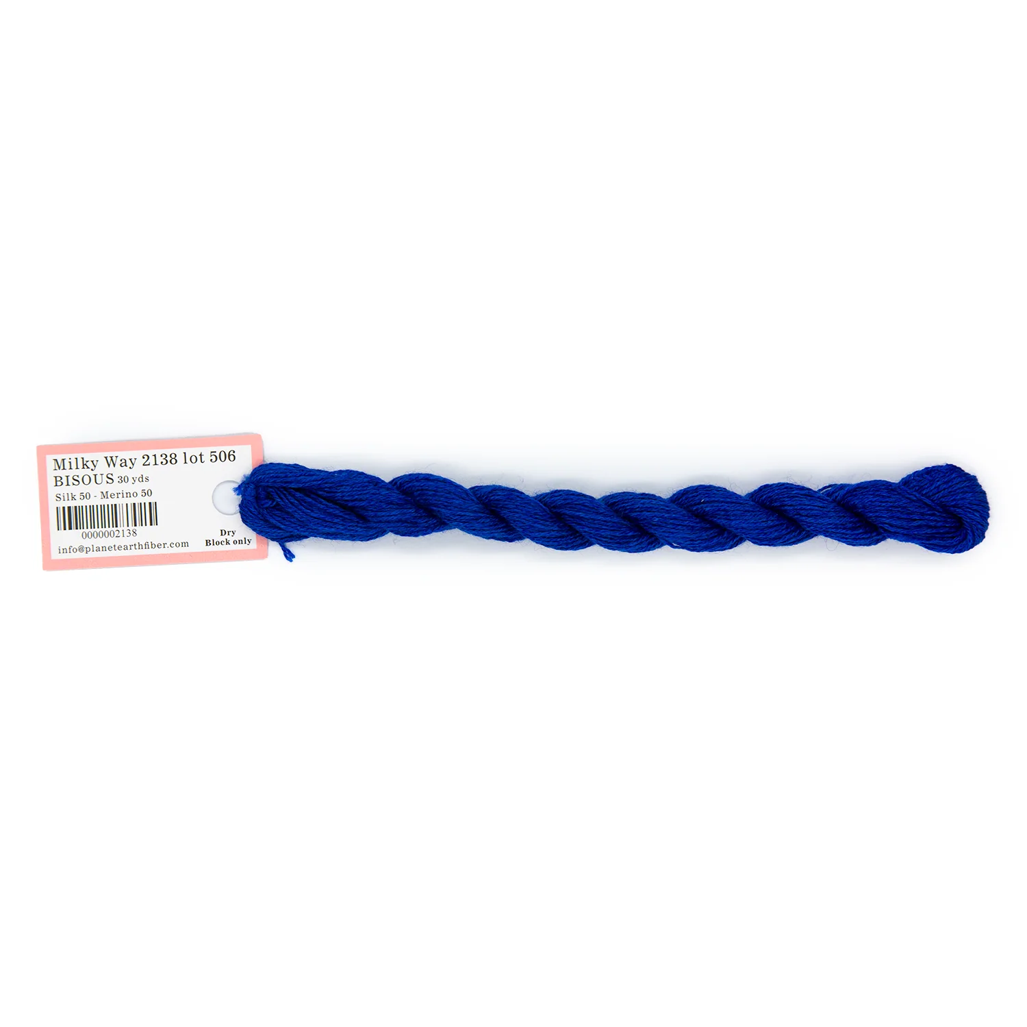 This is Bisous from Planet Earth in color 2138 Milky Way. Bisous is a multipurpose silk-wool blend from Tilli Tomas. Use as-is for very light coverage on 18 mesh or for embroidery. Use additional plies to build up coverage on canvas - for full coverage, we recommend 2 plies on 18 mesh and 3 plies on 13 mesh.