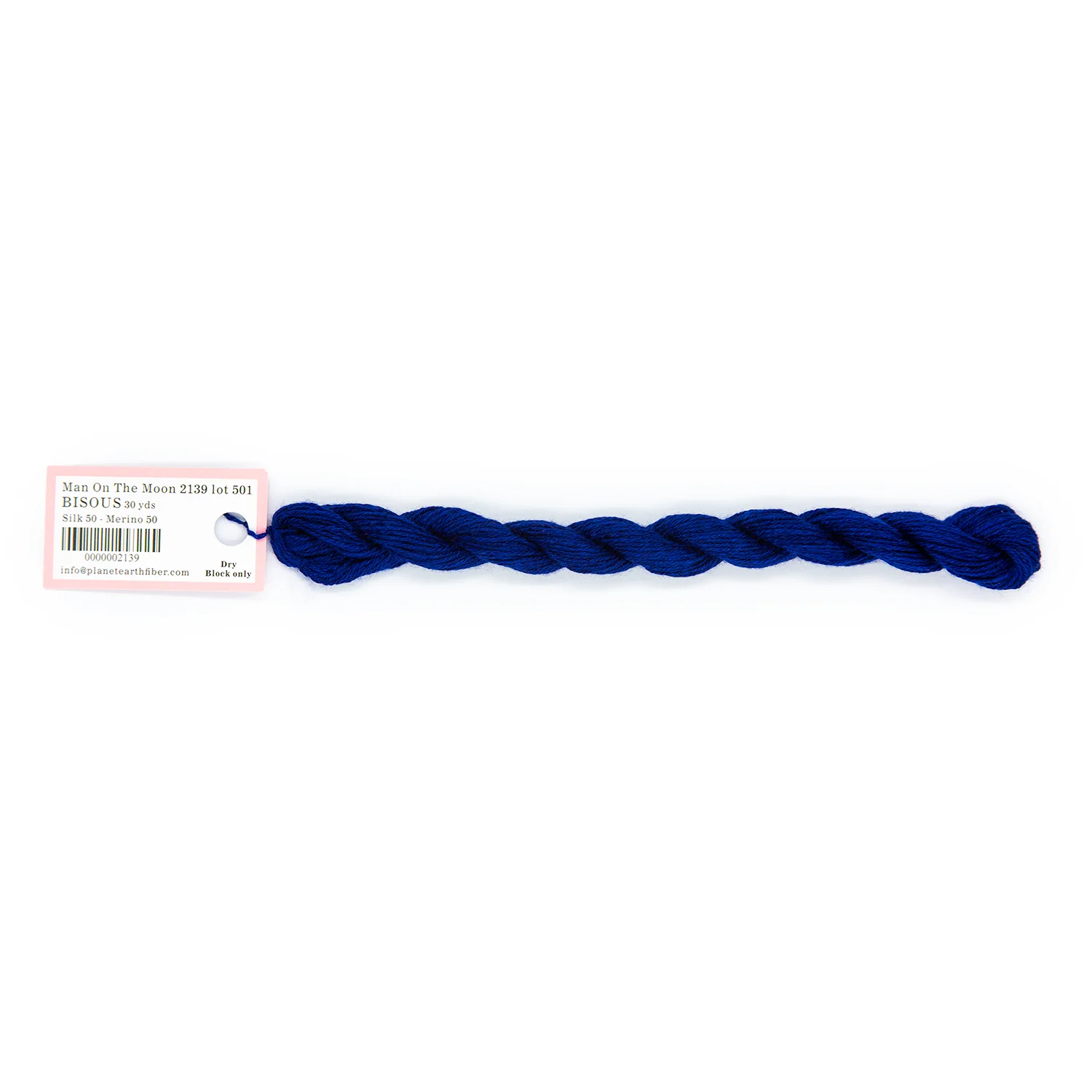 This is Bisous from Planet Earth in color 2139 Man on the Moon. Bisous is a multipurpose silk-wool blend from Tilli Tomas. Use as-is for very light coverage on 18 mesh or for embroidery. Use additional plies to build up coverage on canvas - for full coverage, we recommend 2 plies on 18 mesh and 3 plies on 13 mesh.