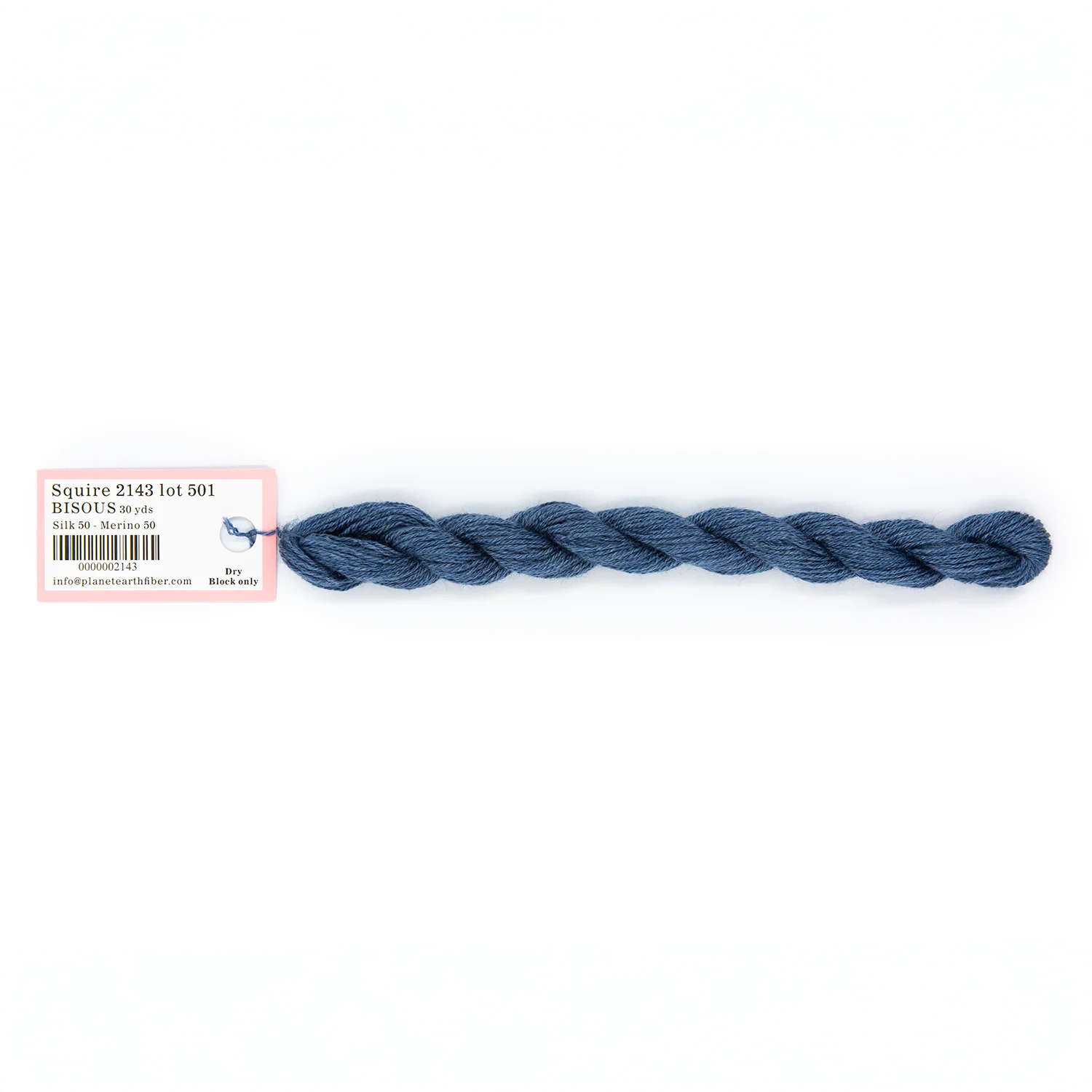 This is Bisous from Planet Earth in color 2143 Squire. Bisous is a multipurpose silk-wool blend from Tilli Tomas. Use as-is for very light coverage on 18 mesh or for embroidery. Use additional plies to build up coverage on canvas - for full coverage, we recommend 2 plies on 18 mesh and 3 plies on 13 mesh.
