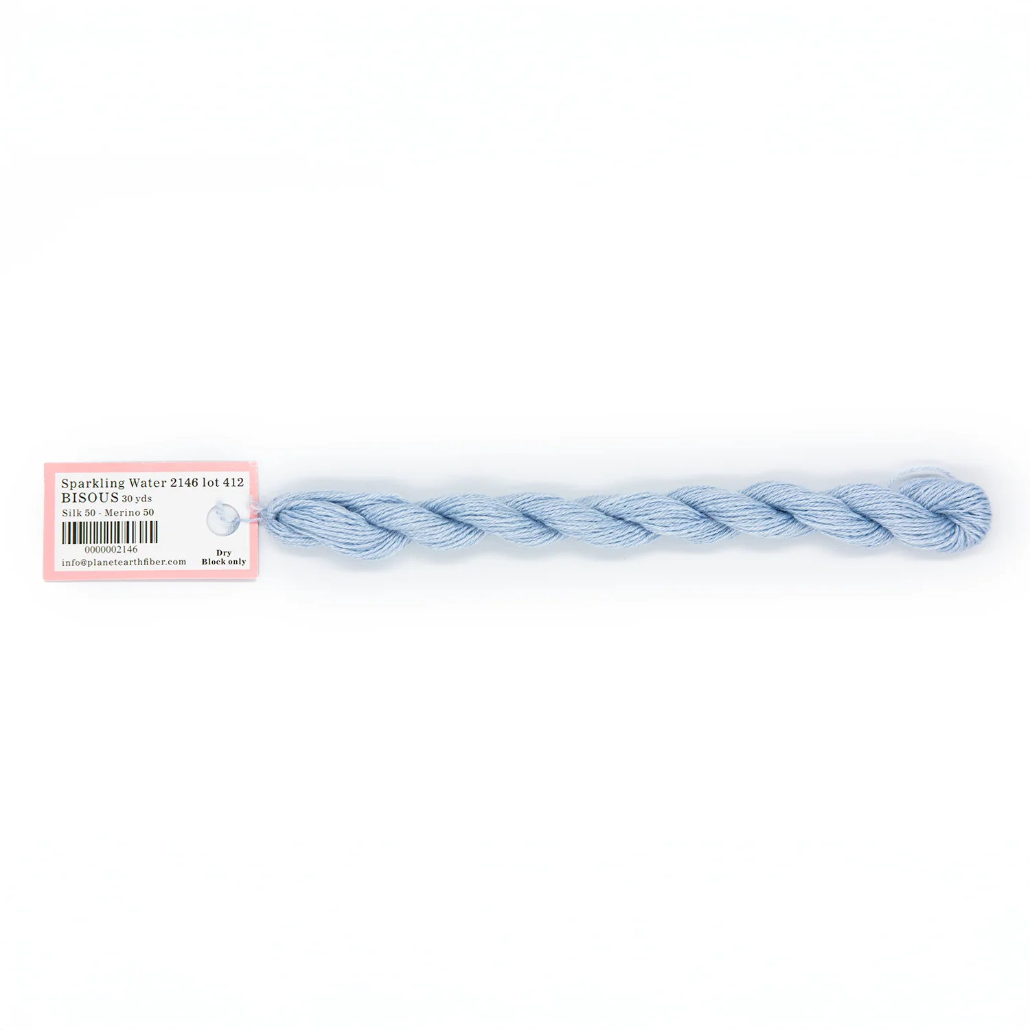 This is Bisous from Planet Earth in color 2146 Sparkling Water. Bisous is a multipurpose silk-wool blend from Tilli Tomas. Use as-is for very light coverage on 18 mesh or for embroidery. Use additional plies to build up coverage on canvas - for full coverage, we recommend 2 plies on 18 mesh and 3 plies on 13 mesh.