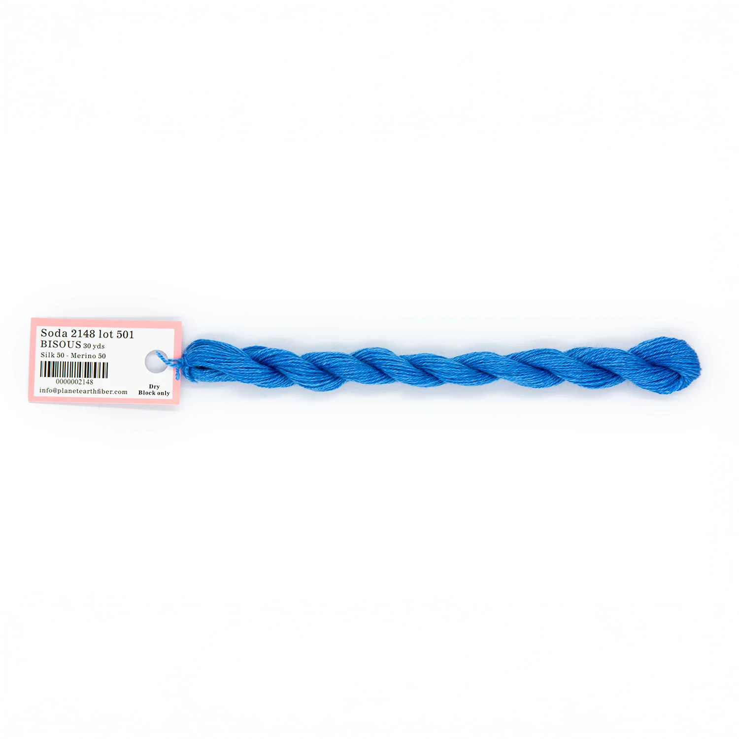 This is Bisous from Planet Earth in color 2148 Soda. Bisous is a multipurpose silk-wool blend from Tilli Tomas. Use as-is for very light coverage on 18 mesh or for embroidery. Use additional plies to build up coverage on canvas - for full coverage, we recommend 2 plies on 18 mesh and 3 plies on 13 mesh.
