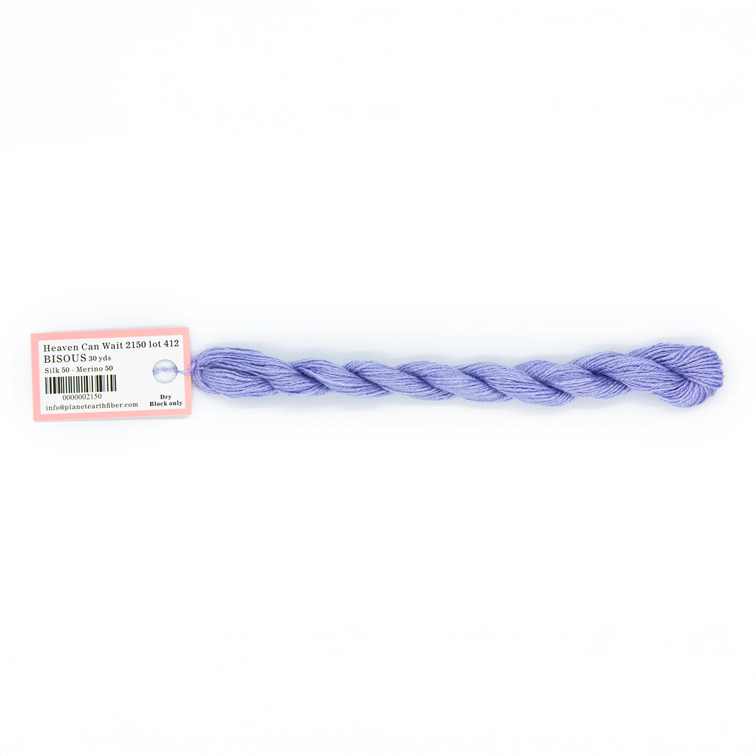 This is Bisous from Planet Earth in color 2150 Heaven Can Wait. Bisous is a multipurpose silk-wool blend from Tilli Tomas. Use as-is for very light coverage on 18 mesh or for embroidery. Use additional plies to build up coverage on canvas - for full coverage, we recommend 2 plies on 18 mesh and 3 plies on 13 mesh.