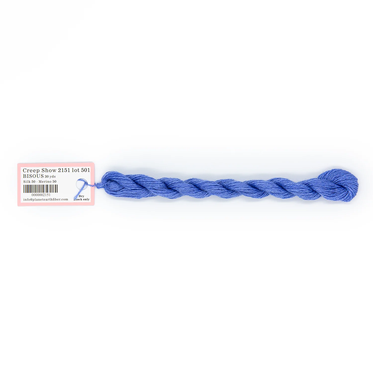This is Bisous from Planet Earth in color 2151 Creep Show. Bisous is a multipurpose silk-wool blend from Tilli Tomas. Use as-is for very light coverage on 18 mesh or for embroidery. Use additional plies to build up coverage on canvas - for full coverage, we recommend 2 plies on 18 mesh and 3 plies on 13 mesh.