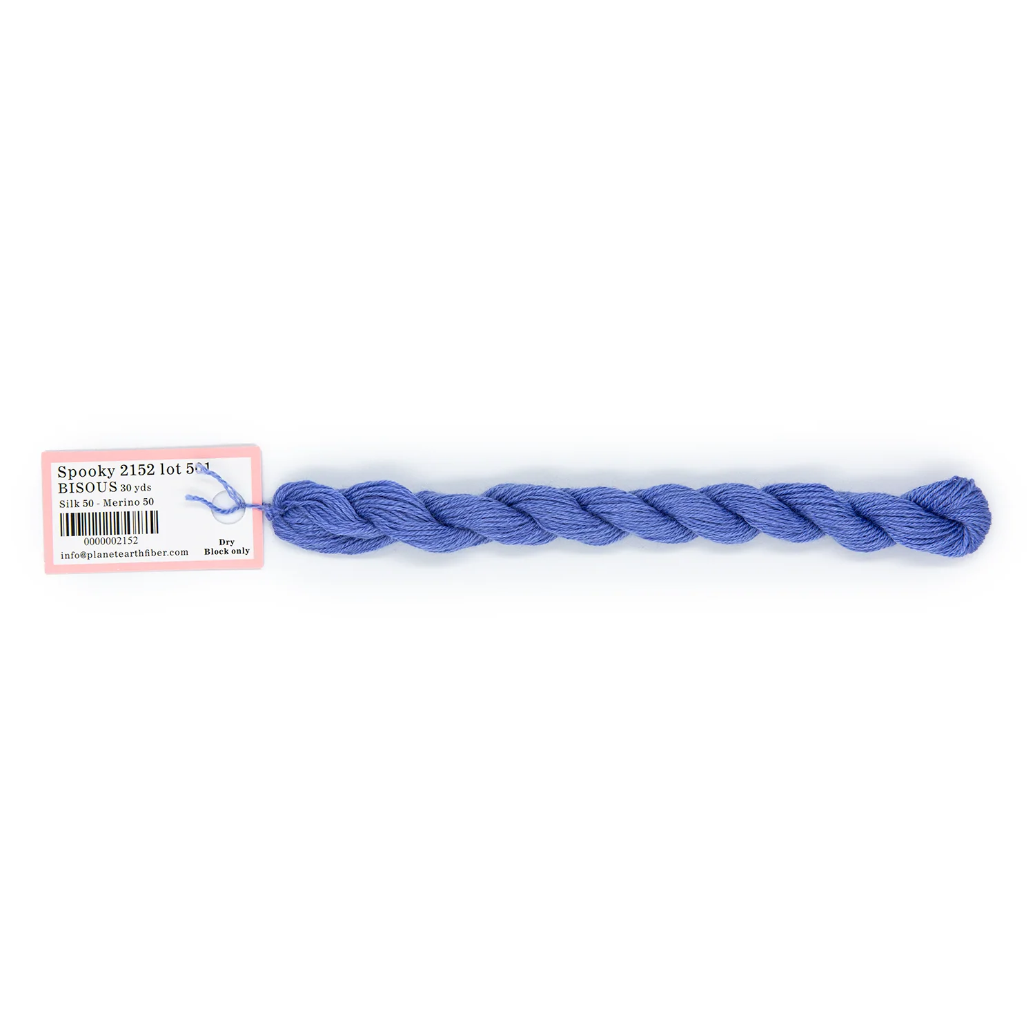 This is Bisous from Planet Earth in color 2152 Spooky. Bisous is a multipurpose silk-wool blend from Tilli Tomas. Use as-is for very light coverage on 18 mesh or for embroidery. Use additional plies to build up coverage on canvas - for full coverage, we recommend 2 plies on 18 mesh and 3 plies on 13 mesh.