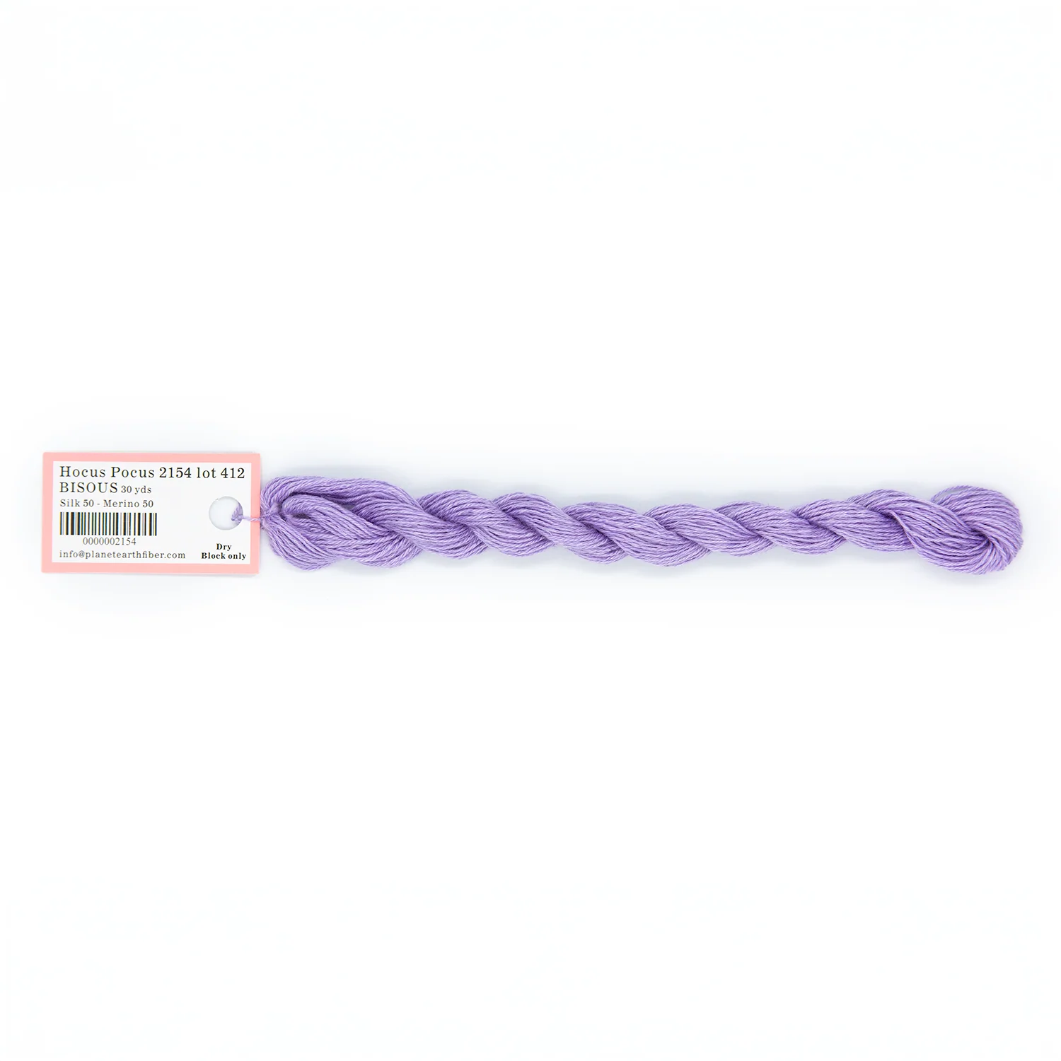 This is Bisous from Planet Earth in color 2154 Hocus Pocus. Bisous is a multipurpose silk-wool blend from Tilli Tomas. Use as-is for very light coverage on 18 mesh or for embroidery. Use additional plies to build up coverage on canvas - for full coverage, we recommend 2 plies on 18 mesh and 3 plies on 13 mesh.