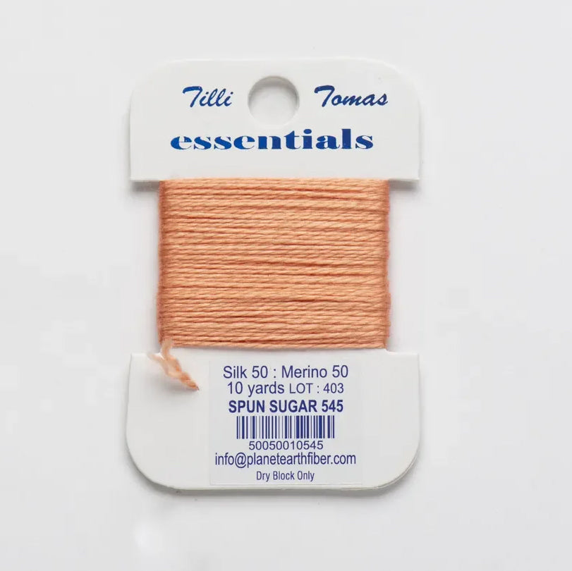These are Tilli Tomas Essentials from Planet Earth in color 545 Spun Sugar. A silk-wool blend perfect for 18 mesh canvases. 1 ply on 18 mesh. Colors match Milan.