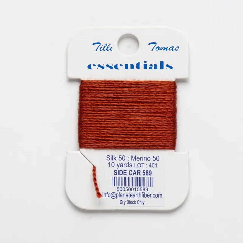 These are Tilli Tomas Essentials from Planet Earth in color 589 Side Car. A silk-wool blend perfect for 18 mesh canvases. 1 ply on 18 mesh. Colors match Milan.