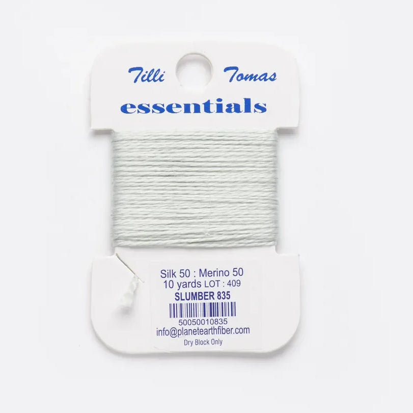 These are the Tilli Tomas Essentials from Planet Earth in Slumber. A silk-wool blend perfect for 18 mesh canvases. 1 ply on 18 mesh. Colors match Milan.