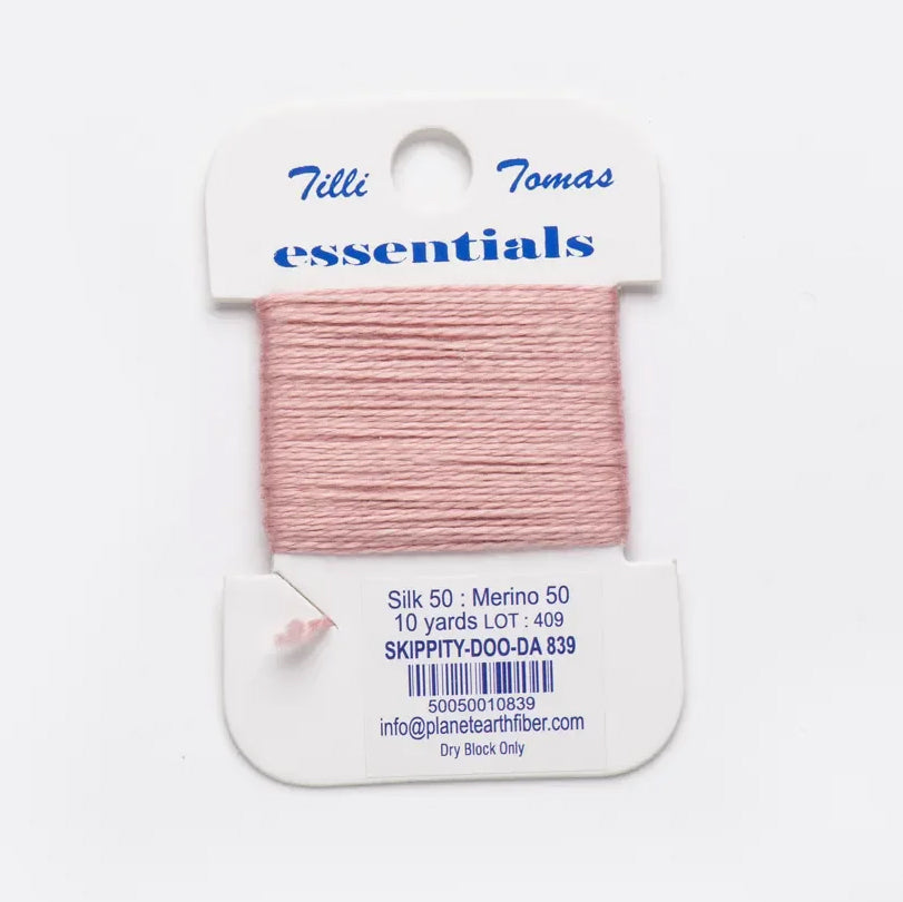 These are the Tilli Tomas Essentials from Planet Earth in Skippity-doo-da. A silk-wool blend perfect for 18 mesh canvases. 1 ply on 18 mesh. Colors match Milan.