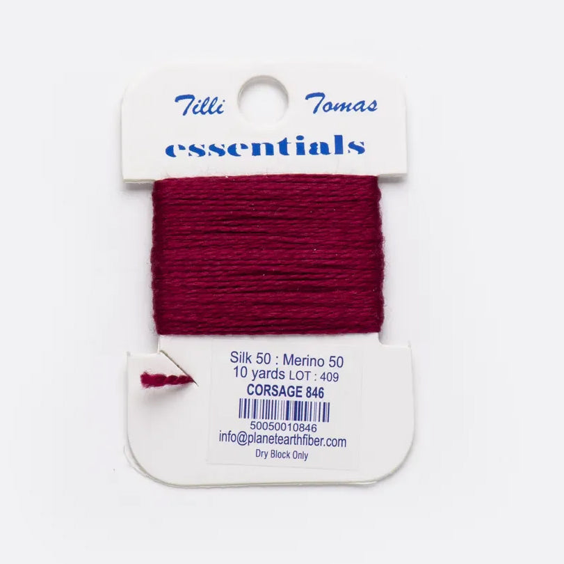 These are the Tilli Tomas Essentials from Planet Earth in Corsage. A silk-wool blend perfect for 18 mesh canvases. 1 ply on 18 mesh. Colors match Milan.