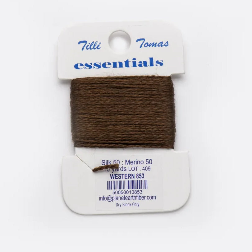 These are the Tilli Tomas Essentials from Planet Earth in Western. A silk-wool blend perfect for 18 mesh canvases. 1 ply on 18 mesh. Colors match Milan.