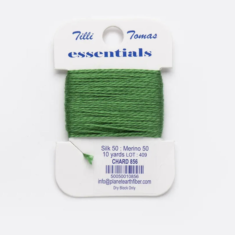 These are the Tilli Tomas Essentials from Planet Earth in Chard. A silk-wool blend perfect for 18 mesh canvases. 1 ply on 18 mesh. Colors match Milan.