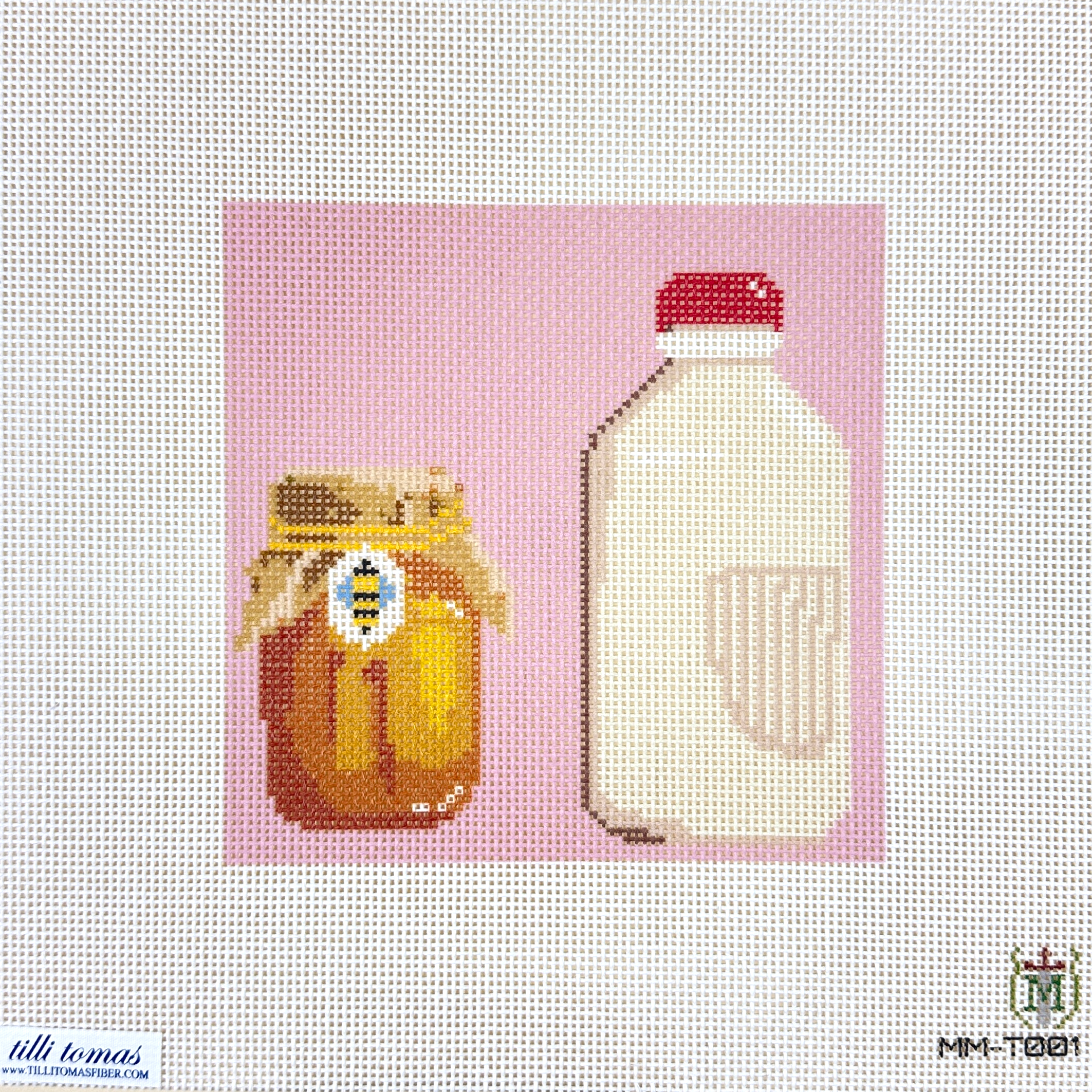 This stitch printed needlepoint canvas by Misty Morrow for Tilli Tomas features a jar of honey and glass bottle of milk. It is sized to fit the Planet Earth large self-finishing canvas tote.
