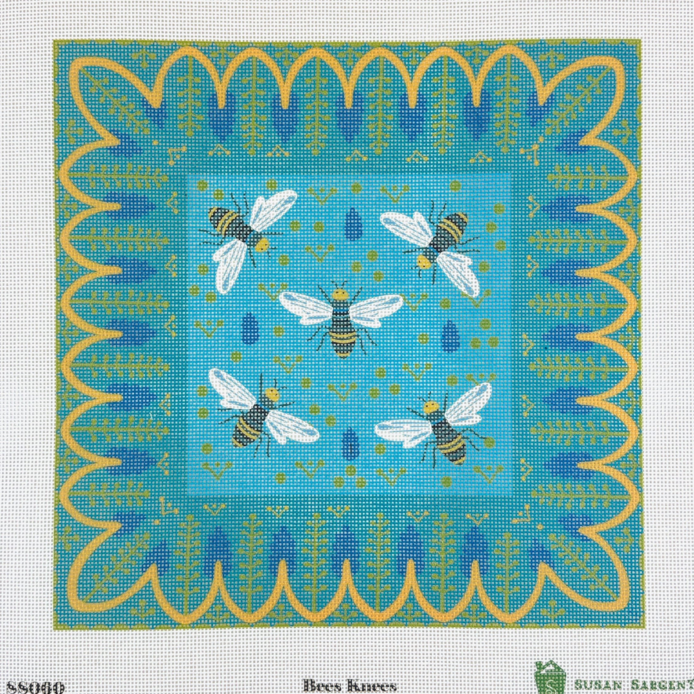 This is a hand painted needlepoint canvas by Susan Sargent from Tilli Tomas featuring a scattering buzzing bees.