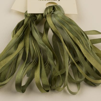 This is a 3.5mm wide hand painted silk ribbon in Rosemary by Treenway Silks. Beautifully variegated silk ribbons. Perfect for silk ribbon embroidery, on fabric or on canvas. Excellent for adding ruffles and dimensional flowers!