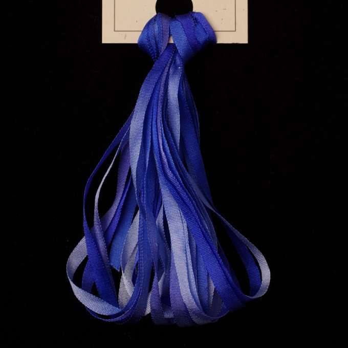 This is a 3.5mm wide hand painted silk ribbon in Delphinium by Treenway Silks. Beautifully variegated silk ribbons. Perfect for silk ribbon embroidery, on fabric or on canvas. Excellent for adding ruffles and dimensional flowers!