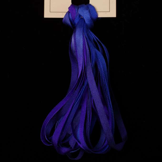 This is a 3.5mm wide hand painted silk ribbon in Iris by Treenway Silks. Beautifully variegated silk ribbons. Perfect for silk ribbon embroidery, on fabric or on canvas. Excellent for adding ruffles and dimensional flowers!