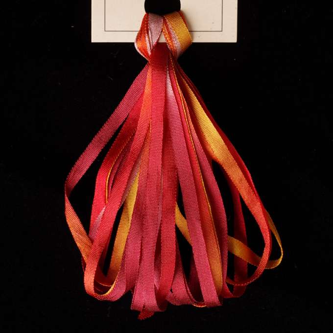 This is a 3.5mm wide hand painted silk ribbon in Kathmandu by Treenway Silks. Beautifully variegated silk ribbons. Perfect for silk ribbon embroidery, on fabric or on canvas. Excellent for adding ruffles and dimensional flowers!