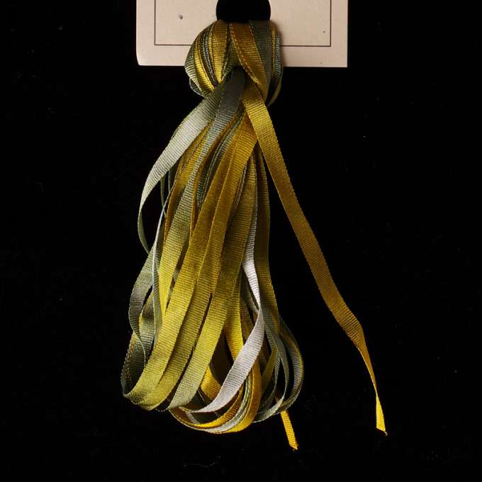 This is a 3.5mm wide hand painted silk ribbon in Seaweed by Treenway Silks. Beautifully variegated silk ribbons. Perfect for silk ribbon embroidery, on fabric or on canvas. Excellent for adding ruffles and dimensional flowers!