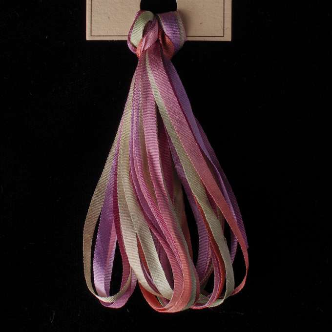 This is a 3.5mm wide hand painted silk ribbon in Ulladulla by Treenway Silks. Beautifully variegated silk ribbons. Perfect for silk ribbon embroidery, on fabric or on canvas. Excellent for adding ruffles and dimensional flowers!