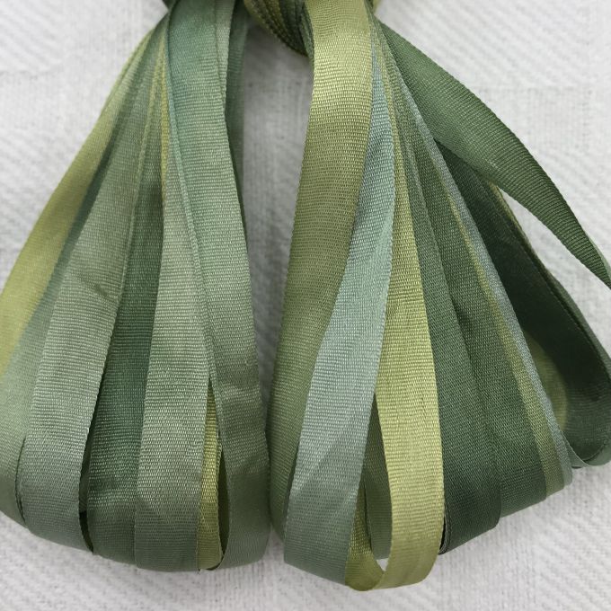 This is a 7mm wide hand painted silk ribbon in Rosemary by Treenway Silks. Beautifully variegated silk ribbons. Perfect for silk ribbon embroidery, on fabric or on canvas. Excellent for adding ruffles and dimensional flowers!