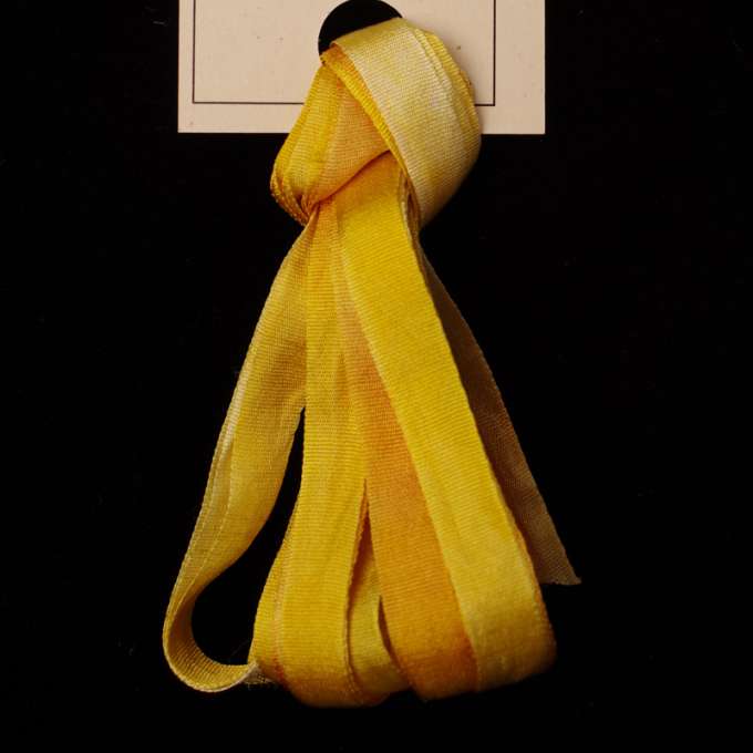 This is a 7mm wide hand painted silk ribbon in Daffodil by Treenway Silks. Beautifully variegated silk ribbons. Perfect for silk ribbon embroidery, on fabric or on canvas. Excellent for adding ruffles and dimensional flowers!