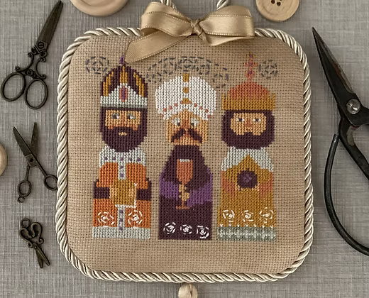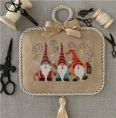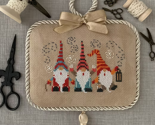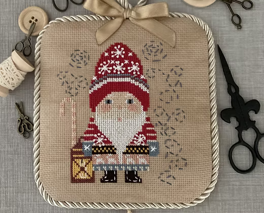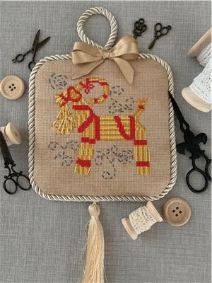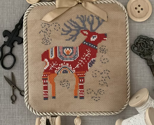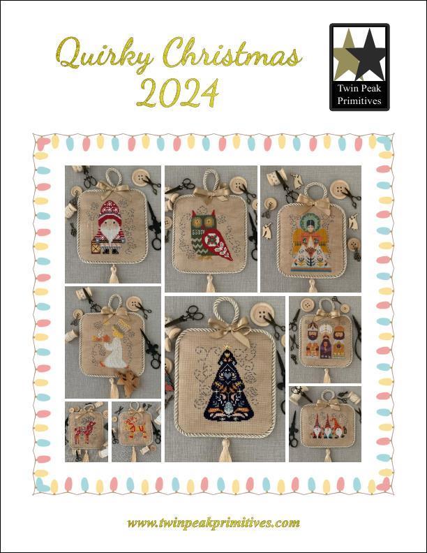 This cross stitch pattern sampler from Twin Peaks Primitives features several classic animals and symbols that are associated with Christmas. It contains 9 different small patterns. The example uses DMC thread.