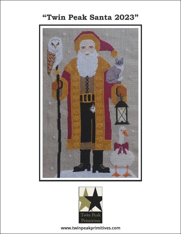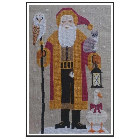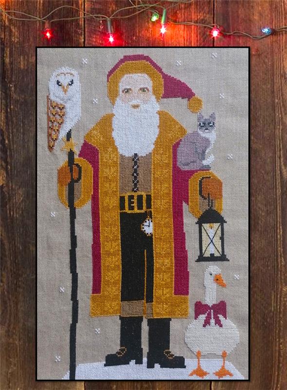 This cross stitch pattern by Twin Peak Primitives features a handsome Santa with an owl, cat, and goose.
