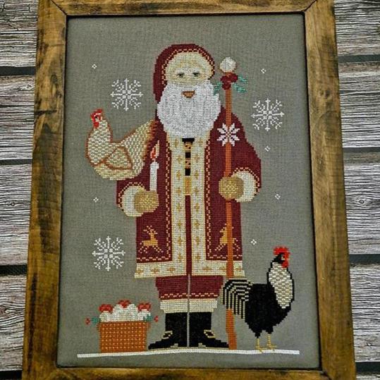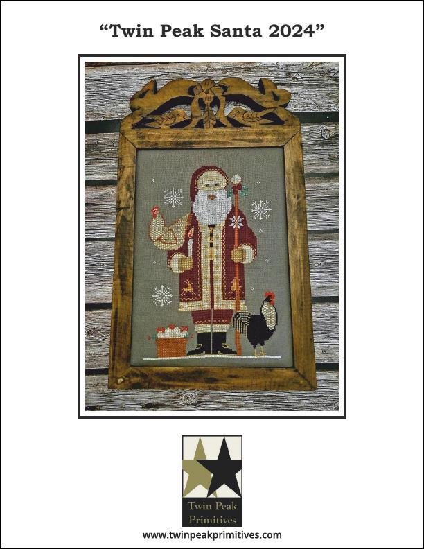 This cross stitch pattern by Twin Peak Primitives features a Santa with chickens and eggs.