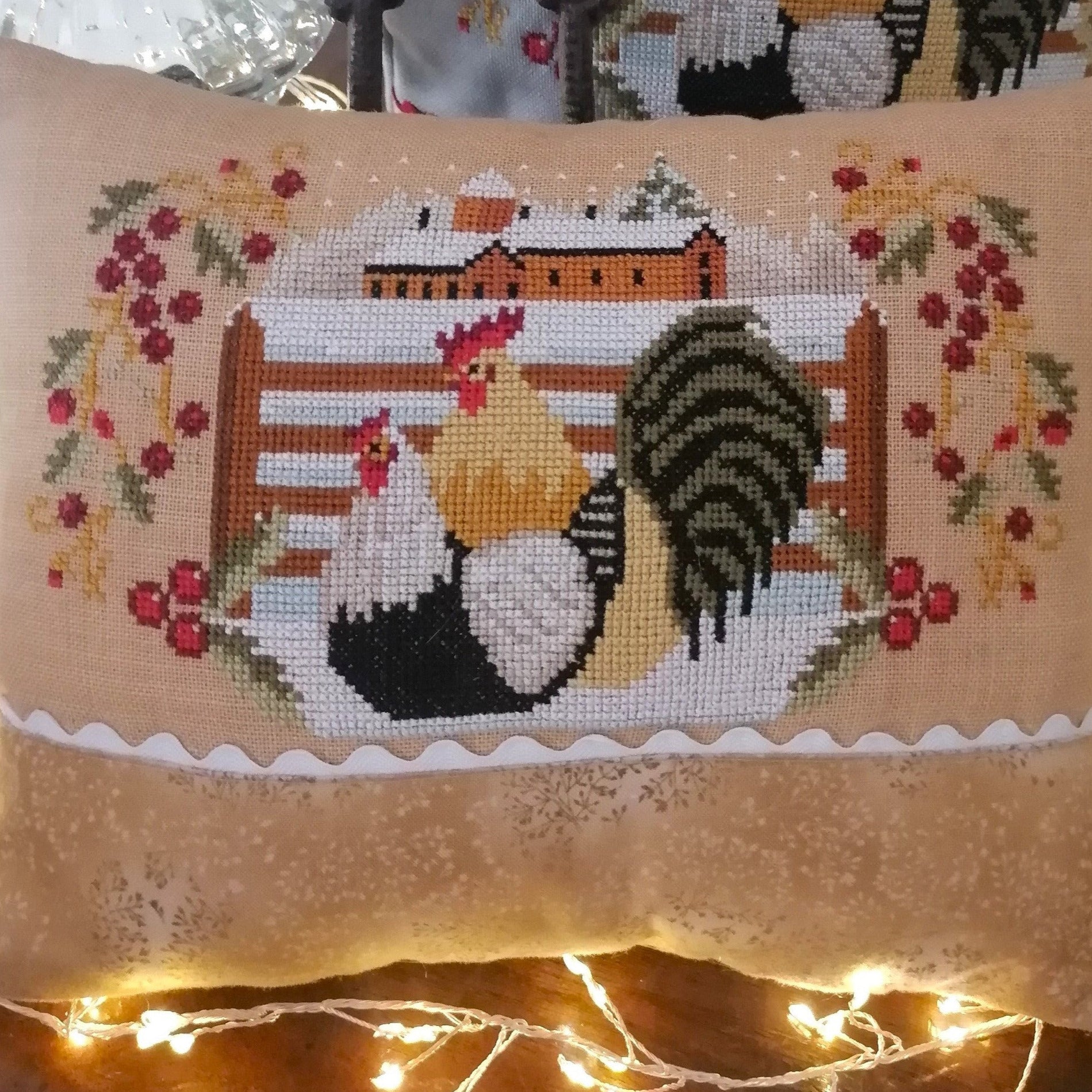 This is a printed cross stitch pattern by Twin Peaks Primitives. It features two hens sitting in front of a wooden fence in the snow, with a farmhouse in the distance, flanked by holly. The example as stitched uses DMC cotton floss on 32 count Weeks Dye Works Linen in the color Cappuccino.