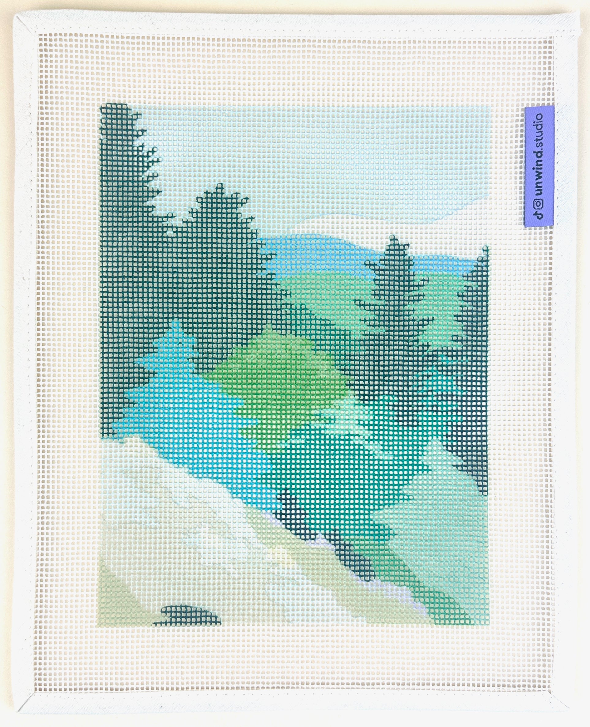 This needlepoint canvas by Unwind Studio is printed on Zweigart Interlock needlepoint canvas. It features a mountain spring scene by Elizabeth Lang.