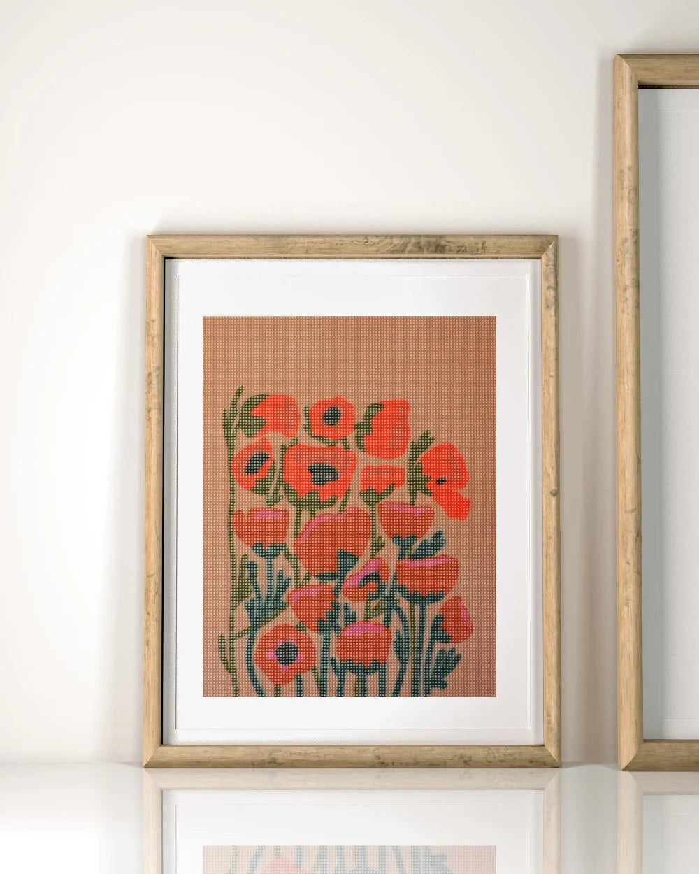 The Poppy Blobs Needlepoint Kit is an intriguing folk design that allows you to create a unique and captivating piece of art inspired by poppy flowers.