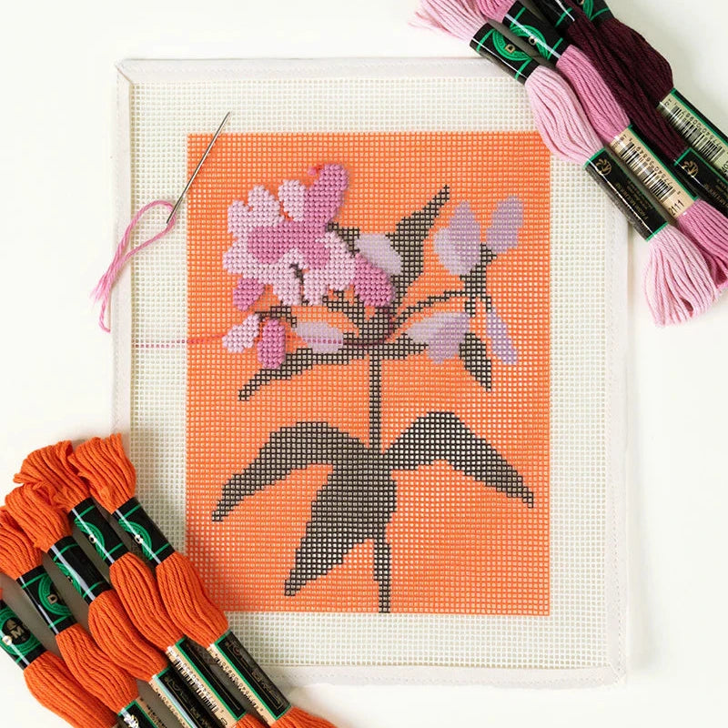 Stitch this vibrant floral needlepoint design by Bekah Worley. Vibrant colors and delicate details make this needlepoint kit a great way to start your needlepoint journey! The kit includes a high-quality canvas that features the pre-printed artwork, providing a clear and easy-to-follow guide for stitching. This makes it ideal for those new to needlepoint, allowing them to confidently create a stunning piece of art.