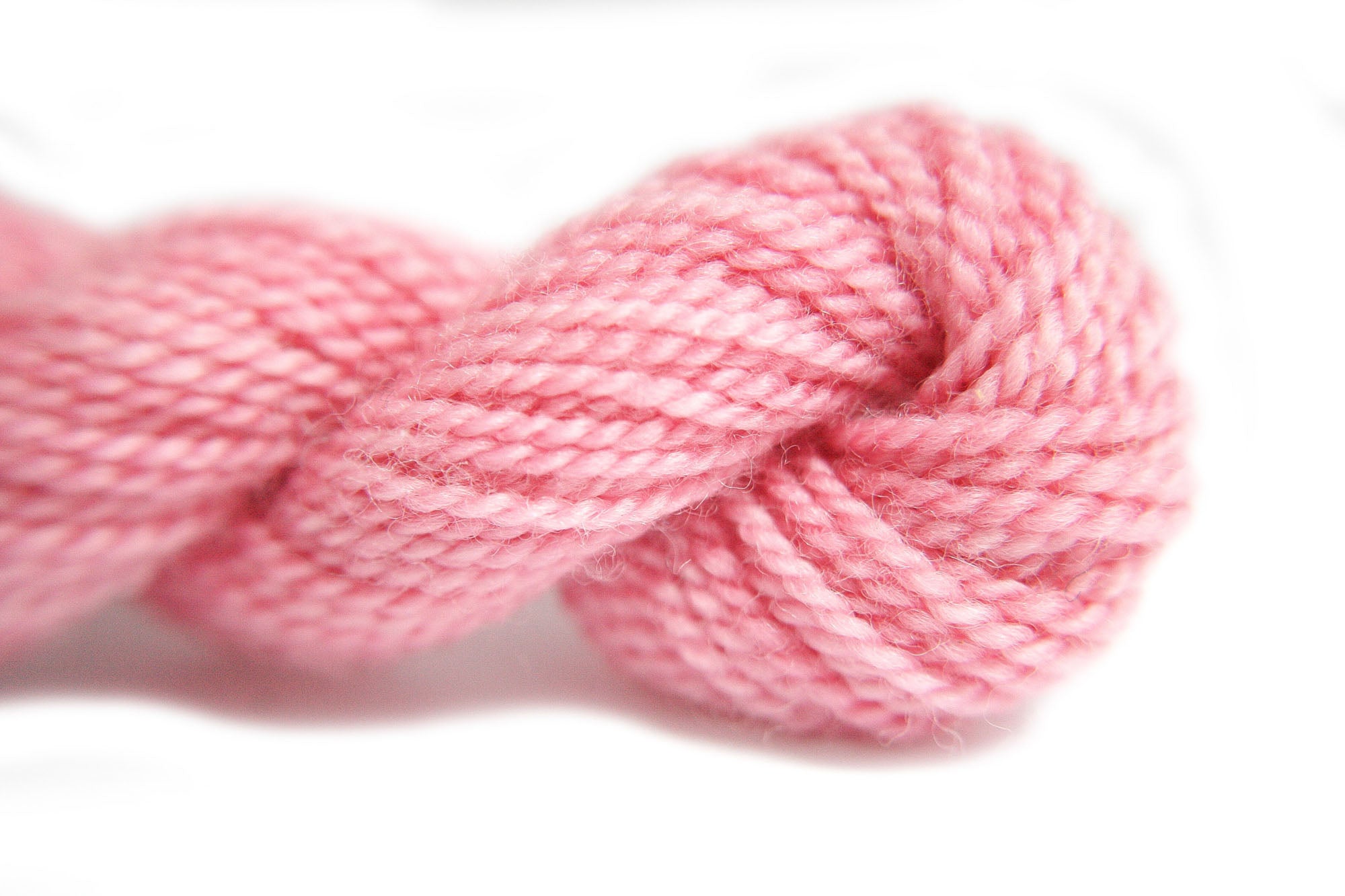 This is Merino from Vineyard in color 1211 Coral Pink. 1 ply on 13 and 18 mesh. Great for belts or other wearables that need to be sturdy.